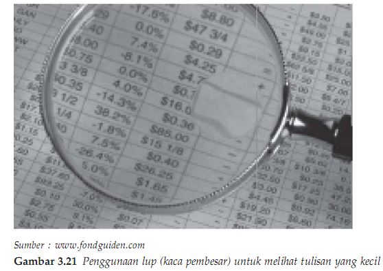 Orang dapat melihat segala indahan di dunia ini dengan menggunakan alat optik mata. Penggunaan alat optik mata untuk melihat sesuatu, contoh Gambar 3.19.