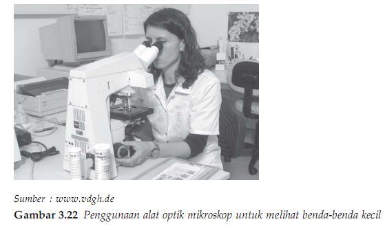 Pada penelitian dalam bidang biologi, farmasi, medis,dan sebagainya, sering digunakan mikroskop untuk mengamati benda-benda yang tidak mungkin dapat dilihat dengan mata telanjang. Contoh penggunaan alat optik mikroskop untuk melihat benda-benda kecil pada Gambar 3.22.