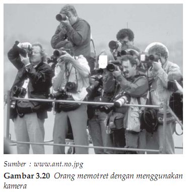 Dalam kehidupan sehari-hari, kita sering menjumpai orang mengabadikan suatu peristiwa dengan cara mengambil gambar peristiwa tersebut. Pengambilan gambar dilakukan dengan alat optik kamera. Kamera yang digunakan untuk mengambil gambar bisa kamera dengan film atau kamera tanpa film (digital). Penggunaan kamera untuk mengambil gambar c pada Gambar 3. 20.