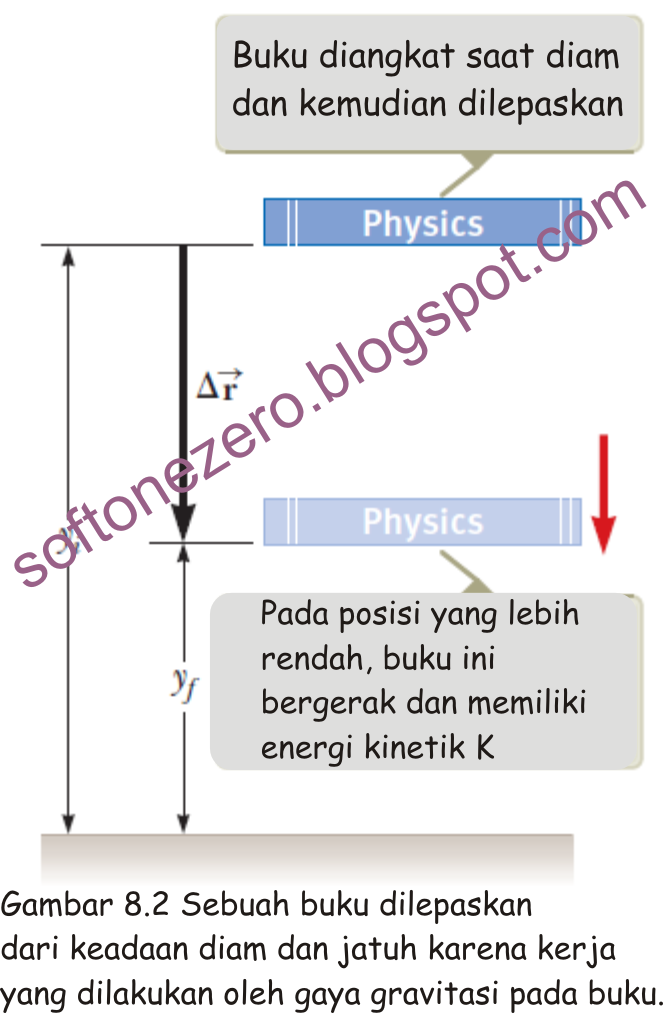 Mari kita mengalihkan fokus kita kepada usaha yang dilakukan pada buku saja oleh gaya gravitasi (Gambar 8.2) dengan bukunya jatuh kembali ke tinggi aslinya. Sebagai buku jatuh dari yi ke yf, usaha yang dilakukan oleh gaya gravitasi pada buku ini: