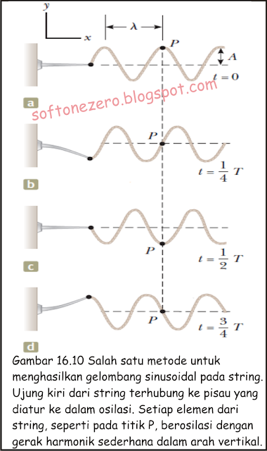 Pada Gambar 16.1, kita menunjukkan cara membuat pulsa dengan menyentak string tegang atas dan ke bawah. Untuk membuat serangkaian seperti pulsa-gelombang-mari kita ganti tangan dengan pisau osilasi bergetar dalam gerak harmonik sederhana. Gambar 16.10 merupakan snapshot dari gelombang yang dibuat dengan cara ini pada interval T/4. Karena ujung pisau berosilasi dalam gerak harmonik sederhana setiap elemen dari string, seperti pada P, juga berosilasi secara vertikal dengan gerak harmonik sederhana. Oleh karena itu, setiap elemen dari string dapat diperlakukan sebagai osilator harmonik sederhana bergetar dengan frekuensi yang sama dengan frekuensi osilasi dari blade. Perhatikan bahwa ketika setiap elemen berosilasi dalam arah y, gelombang berjalan dalam arah x dengan kecepatan v Tentu saja, ini merupakan definisi gelombang transversal.