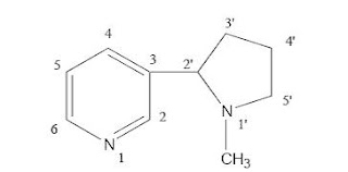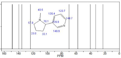 Proton NMR nikotin menunjukan bahwa terdapat empat aromatic proton pada chemical shift antara 7,00 – 9,00 ppm, dimana salah satunya adalah singlet karena letaknya terisolasi atau tidak berdekatan dengan aromatic proton yang lain. ke empat proton ini merupakan proton pada ring pyridinnya. sedangkan antara 1,50 – 3,50 ppm terdapat methyl group (singlet) yang merupakan methyl yang terikat pada N sedangkan proton yang lainnya adalah proton atau hydrogen yang terdapat pada ring pyrolidinnya.