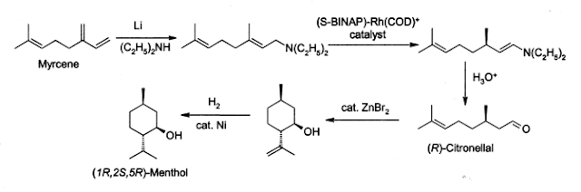 Myrcen merupakan bahan baku utama pembuatan menthol, aktifasi methylena ikatan rangkap yang terdapat pada myrcen dengan penambahan Li sehingga dienthylamin akan terikat pada karbon tersebut. Penataan ulang ikatan rangkap pada senyawa ini dilakukan dengan katalis yang selanjutnya diasidifikasi sehingga menghasilkan citronelal. Citronelal disiklisasi yang dilanjutkan dengan peroses reduksi akan menghasilkan produk akhir menthol.