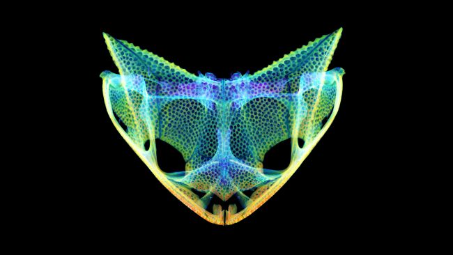 Warna tiruan dalam gambar menunjukkan variasi dalam kepadatan tulang di bagian tengkorak yang berbeda, kata penulis studi utama Daniel Paluh, seorang kandidat doktoral di Departemen Biologi di University of Florida. Dalam gambar katak bertanduk Hemiphractus scutatus, “bagian biru dari tengkorak, seperti tempurung kepala, adalah kepadatan yang lebih rendah daripada daerah hijau, termasuk rahang,” kata Paluh.