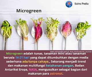 Microgreen adalah Tunas atau usia setalah kecambah tanaman sayur hasil semai yang dapat dikonsumsi langsung. Jika usia kecambah antara 7-14 hari maka usia mocrogreen adalah 14-21 hari atau sebelum usia tanam pada usia 40-60 hari.