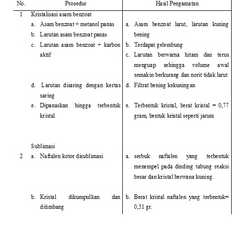 - Dalam proses pemisahan dan pemurnian zat dengan rekristalisasi diperoleh kristal mruni sebesar 0,77 gram dengan persentase sebesar 38,5% untuk asam benzoate dan 0,51 gram dengan persentase sebesar 51 % untuk naftalen.
