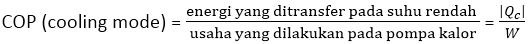 Efektivitas pompa kalor dijelaskan dalam bentuk bilangan yang disebut koefisien kinerja (coefficient of performance/COP). COP ini mirip dengan efisiensi termal untuk mesin kalor bahwa itu adalah rasio dari apa yang Anda dapatkan (energi yang ditransfer ke atau dari reservoir) terhadap apa yang Anda berikan (usaha input). Untuk pompa kalor beroperasi dalam modus pendinginan, “apa yang Anda dapatkan” adalah energi yang dibuangdari reservoir dingin. Kulkas yang paling efektif atau AC adalah salah satu yang menghilangkan jumlah terbesar energi dari reservoir dingin dalam pertukaran untuk sedikit usaha. Oleh karena itu, untuk perangkat ini yang beroperasi dalam modus pendinginan, kita mendefinisikan COP dalam bentuk |Qc|: