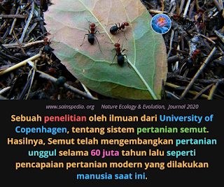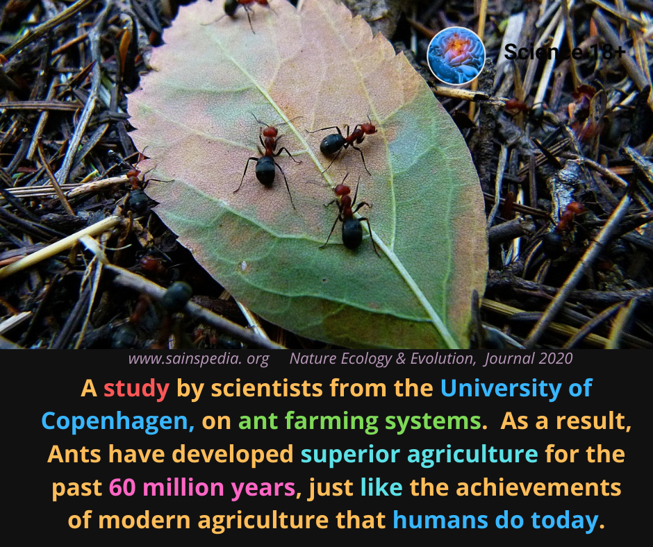 Sebuah penelitian oleh ilmuan dari University of Copenhagen tentang bagaimana Semut telah menjadi petani selama puluhan juta tahun dan berhasil memecahkan teka-teki yang belum pernah dilakukan manusia. Peneliti melaporkan, semut ahli dalam membudidayakan tanaman tahan iklim dan merekayasa tanaman kaya nutrisi.