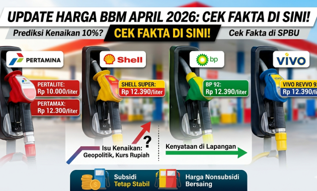Belakangan ini, jagat media sosial diramaikan dengan isu kenaikan harga Bahan Bakar Minyak (BBM) nonsubsidi yang diprediksi mencapai 10%. Kabar ini tentu bikin banyak pengendara “ketar-ketir,” mengingat BBM adalah urat nadi aktivitas harian kita. Lantas, apakah benar per 1 April 2026 ini harga bensin di SPBU kesayangan Anda sudah naik?. Update Harga BBM April 2026: Benarkah Ada Kenaikan 10%?